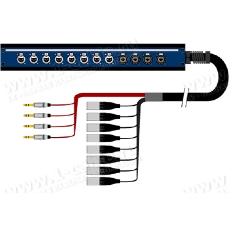 Комбінована 12-канальна аудіо система виконана на базі гнучкого мультікору PolyWire (KLOTZ a-i-s). На одній стороні мультікору встановлена модульна комутаційна коробка Box-1U зі змінною панеллю 19". Усі роз'єми мають посадочне шасі під D-посадку. Встановлені панельні роз'єми XLR та Combo-Jack 6.3 мм (Amphenol/Neutrik). Кабельний спіральний ввід PG29 запобігає зламу мультікору та зносу оболонки в місці постійного навантаження. Друга сторона мультікору закінчується розгорнутою багатоканальною кабельною групою (косою) з роз'ємами XLR та Jack 6.3 мм (Amphenol), промаркованими поканально. |