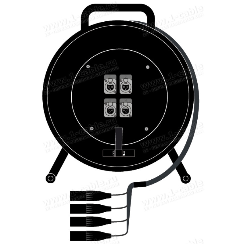 4-канальна система виконана на базі еластичного аудіо мультикора PolyWIRE (KLOTZ a-i-s). З одного боку мультикор зафіксований у котушці, кожен кабель розпаяний на панельний роз'єм XLR D-серії, вмонтований у корпус котушки, з іншого боку мультикор закінчується розгорнутою багатоканальною кабельною групою з роз'ємами XLR, промаркованими поканально. Роз'єми на котушці промарковані відповідно до симетричних звукових каналів. Маркувальна планка з пластиковою захистом встановлена безпосередньо над роз'ємами звукових входів-виходів системи. |