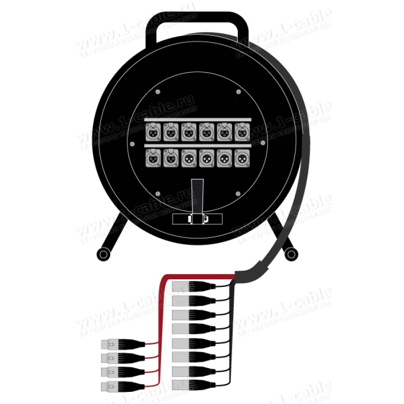 12-канальні системи виконані на базі еластичного аудіо мультикора PolyWIRE (KLOTZ a-i-s). З одного боку мультикор зафіксований у котушці, кожен кабель розпайаний на панельний роз'єм XLR D-серії, вмонтований у корпус котушки, з іншого боку мультикор закінчується розгорнутою багатоканальною кабельною групою з роз'ємами XLR, промаркованими поканально. Роз'єми на котушці промарковані відповідно до симетричних звукових каналів. Маркувальна планка з пластиковою захистом встановлена безпосередньо над роз'ємами звукових входів-виходів системи. |