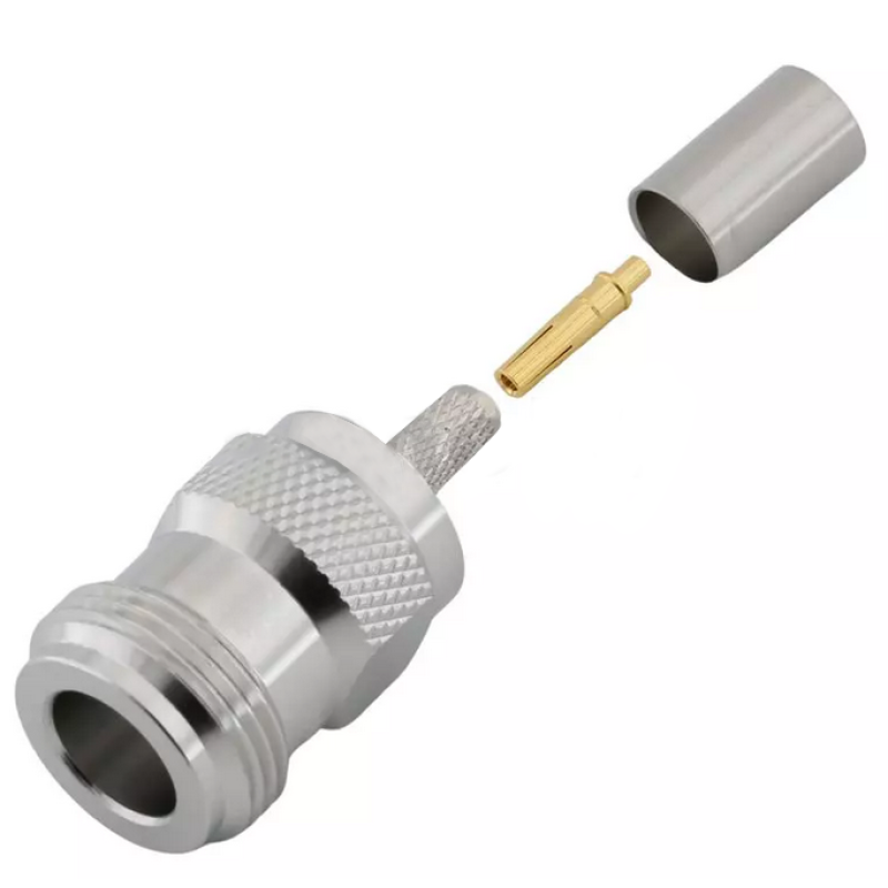 Коннектор N (гнездо) female для кабеля RG316 – это высокочастотный разъем с волновым сопротивлением 50 Ом, предназначенный для использования в радиочастотных системах до 6 ГГц. Он совместим с кабелями RG316, RG174, RG-188A/U, MRC 100 Flex и LMR-100A. Конструкция включает в себя фосфорнобронзовый центральный контакт с золотым покрытием, диэлектрик из фторопласта (PTFE), латунный корпус с никелированным покрытием и медную опрессовочную гильзу.
