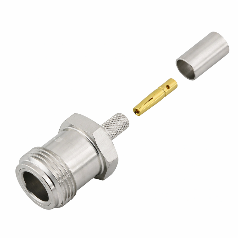 Совместимые типы кабелей для коннектора N (female) включают RG-223, RG-142 и RG-400. Коннектор имеет центральный проводник из фосфорной бронзы с золотым покрытием, что обеспечивает надежность и высокую проводимость. Диэлектрик изготовлен из фторопласта (PTFE), который имеет белый цвет, а тело коннектора сделано из латуни с никелевым покрытием, что придает устойчивость к коррозии. Опрессовочная гильза изготовлена из мягкой меди с никелевым покрытием для лучшего соединения.