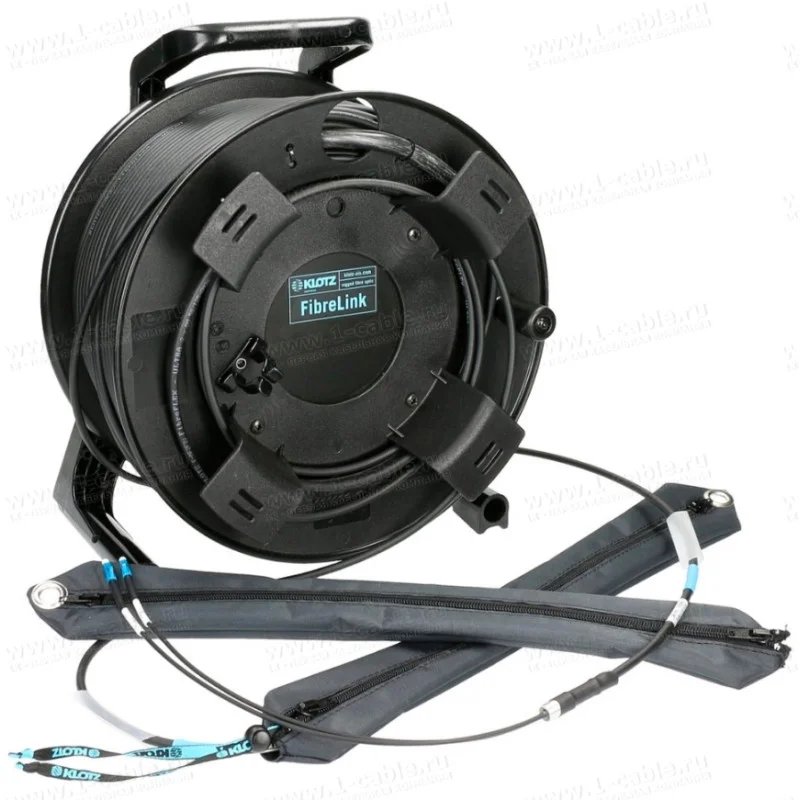 Оптическая кабельная система, выполненная на базе турового кабеля KLOTZ. Кабель имеет усиленную изоляцию PUR-a-Flex, использование которой делает возможным эксплуатацию в экстремальных условиях, при температурах -46°/+71°С. С одной стороны кабель зафиксирован в катушке и намотан на внешний держатель кабеля, установлена пара стандартных оптических разъемов LC- типа. С другой стороны кабель также заканчивается разъемами LC- типа. Контактные группы разъемов закрываются защитными колпачками.