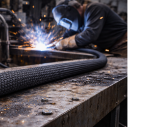 Тут обплетення захищає гнучкі шланги охолодження та кабелі датчиків не лише від фонового жару печей, а й від випадкових бризок розплаву. На відміну від голих склотканин, акрилове покриття HFG дозволяє окалині скочуватися з поверхні, не пропалюючи структуру.
