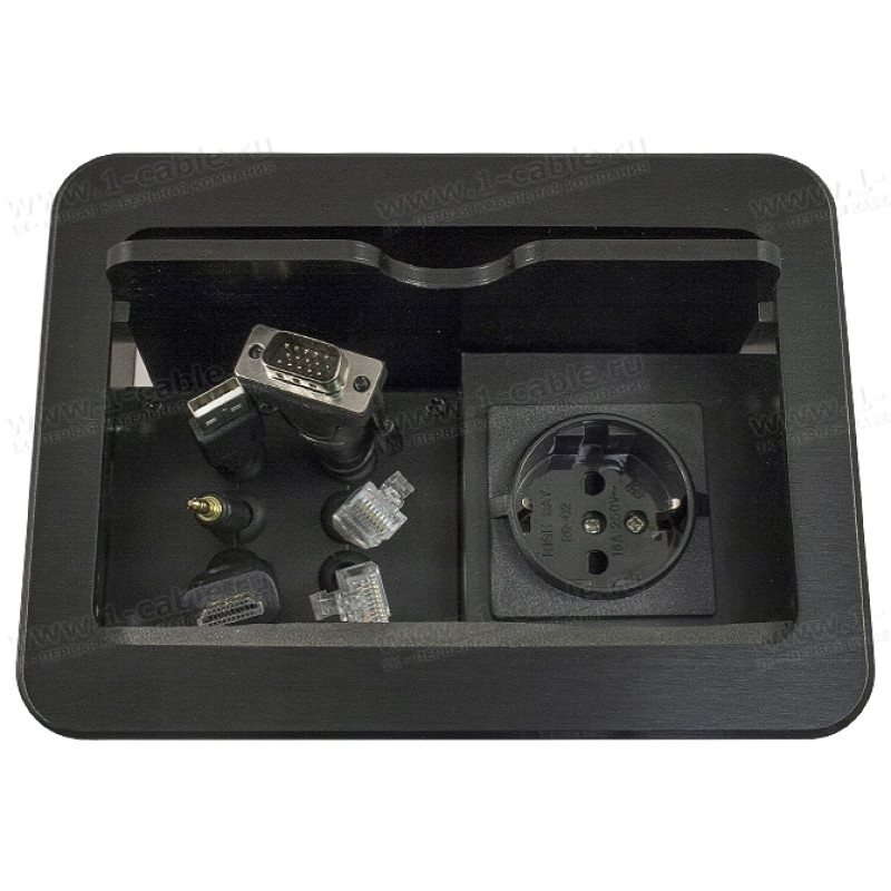 Компактний настільний комутаційний люк TB-FC-SC6E для організації підключень мобільного обладнання в конференц-залах та переговорних кімнатах, не вимагає використання додаткових з'єднувальних кабелів для комутації пристрою з роз'ємами в люку. В люку можна розмістити до шести витягуваних кабелів різного призначення. Модель має один вбудований роз'єм живлення стандарту Schuko.